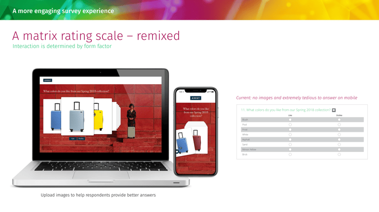 I led a three-week design sprint to reimagine the respondent experience with emerging technologies. The objective was to increase data quality and completion rates through engagement – emotion, fluidity, and touch-first interactions.